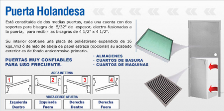 Está constituida de dos medias puertas cada una cuenta con dos soportes para bisagra de 5/32″ de espesor, electro-fusionadas a la puerta, para recibir las bisagras de 4 1/2″ x 4 1/2″